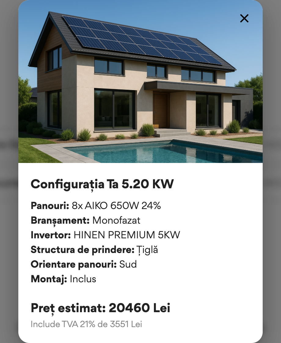 Configurează-ți singur noul tău sistem fotovoltaic cu opțiunile pe care le dorești. La final o sa primești oferta personalizatã pe care o poți descarcă sau trimite pe mail.